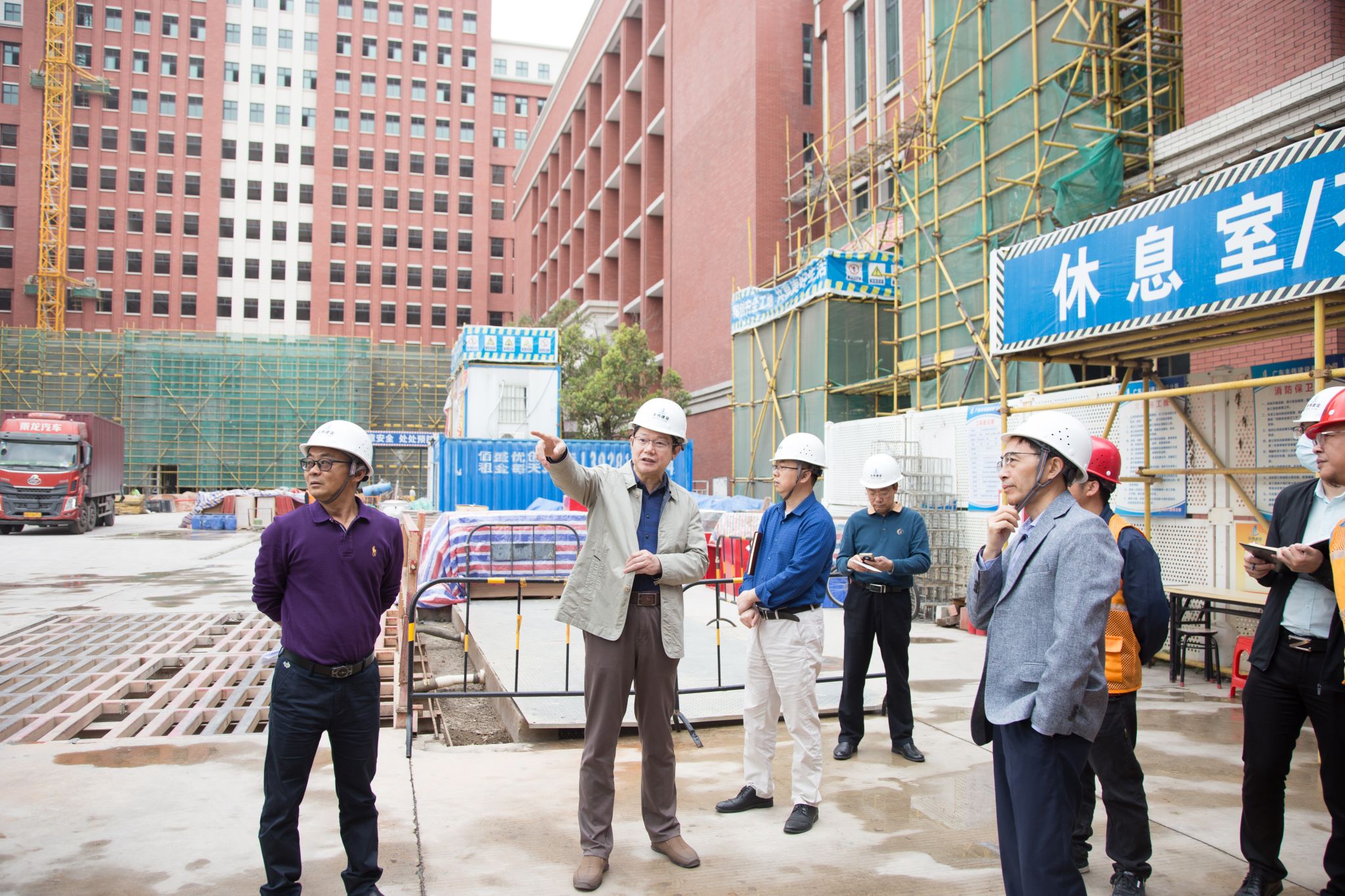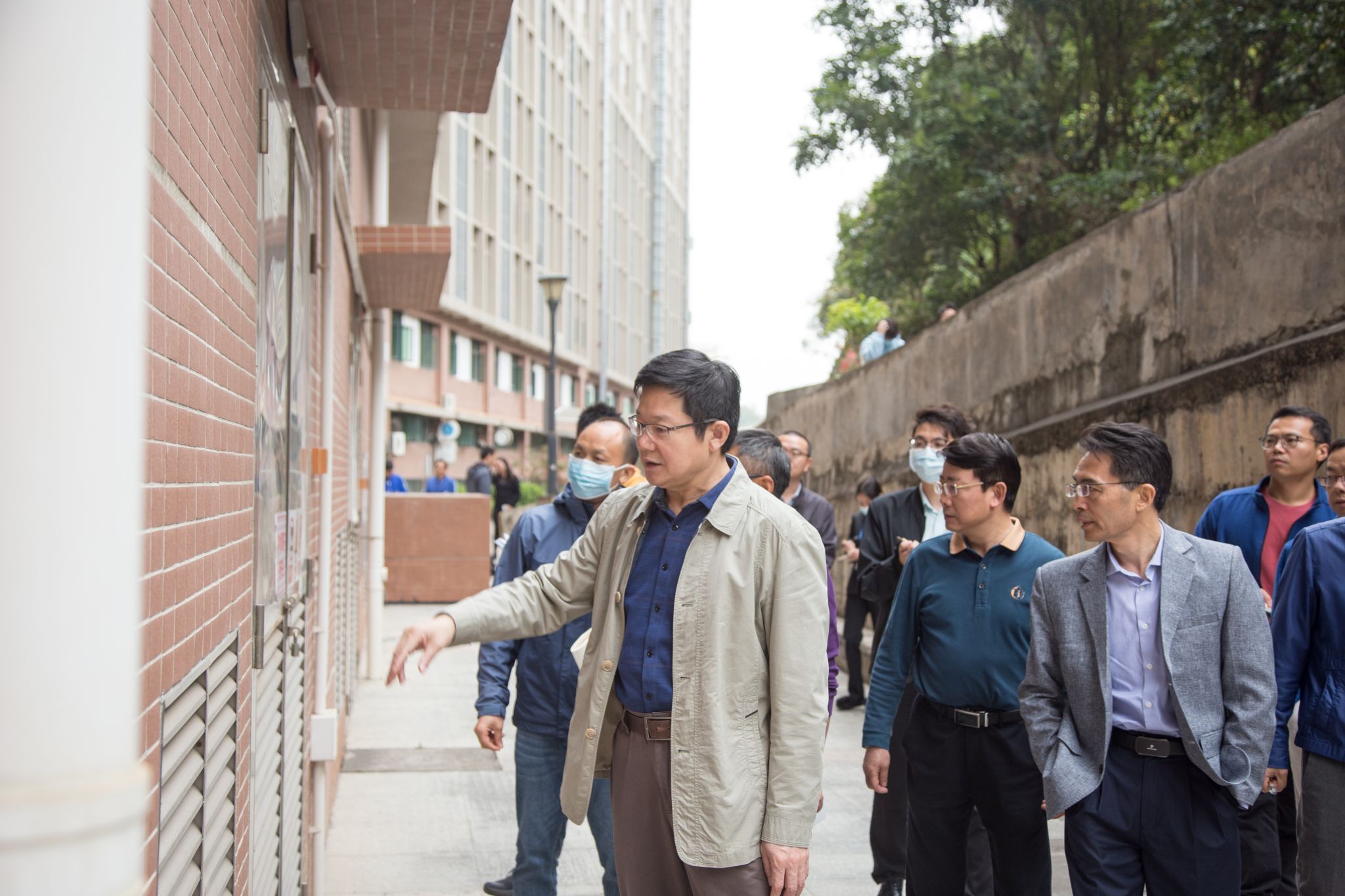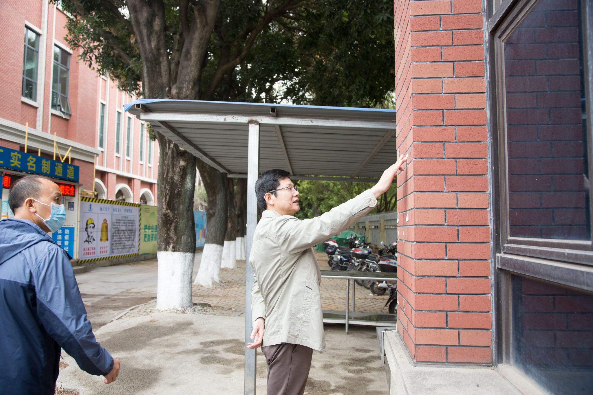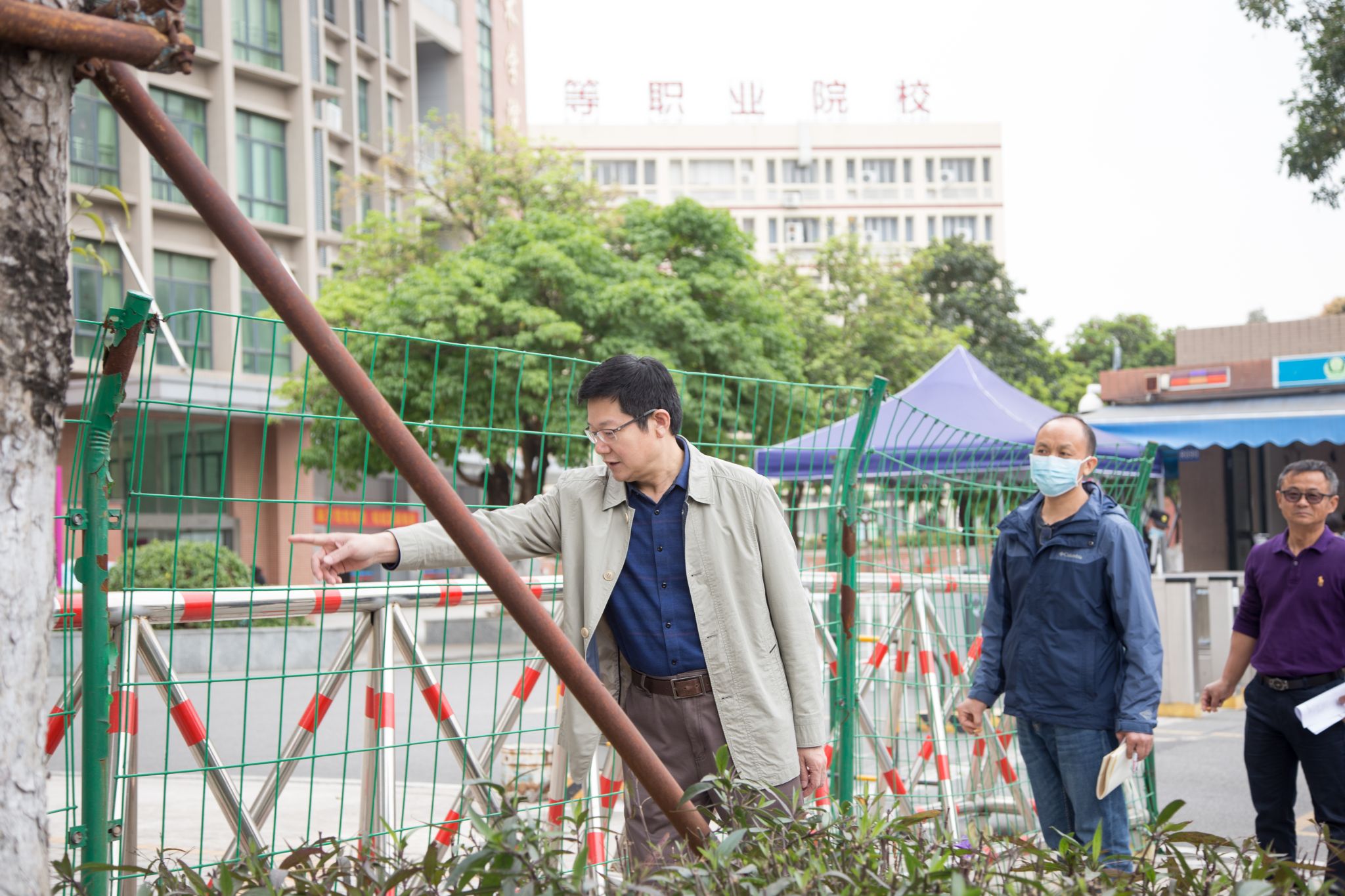 邹鑫书记从学校北门出发,沿路到校园每一个大门出入口、各条主干道、办公楼和教学楼周围以及建筑工地等,实地了解和检查校园环境卫生、公益广告、绿化美化、工地管理等情况,听取相关部门下阶段工作计划,并现场办公指导落实校园停车、环境翻新、秩序管理等问题。