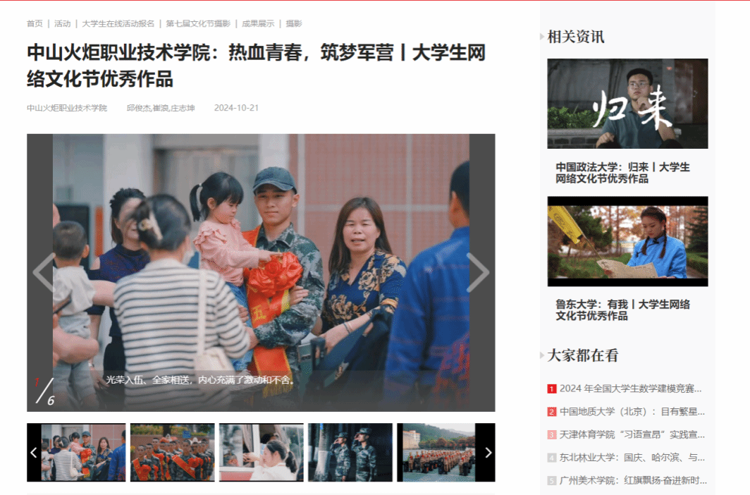 为更好地结合网络文化传播特点,进一步强化优秀作品的宣传展示效果,今年的全国网络文化节推选展示活动调整了奖项名称,原一等奖、二等奖、三等奖和优秀奖分别对应调整为优秀推广作品、优秀展播作品、优秀推荐作品和优秀入围作品。我校推荐的学生摄影作品《热血青春,筑梦军营》(作者:包装设计学院 邱俊杰),经过激烈角逐,最终荣获“优秀展播作品”奖项。该作品已在中国大学生在线官方微信公众号进行展播。