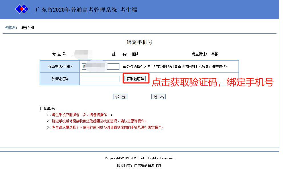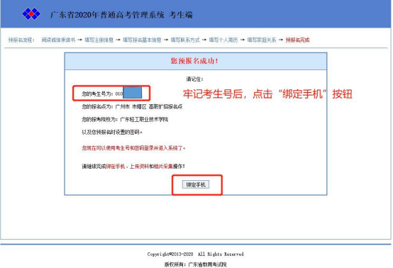 九、预报名完成, 请考生牢记考生号, 点击绑定手机按钮。