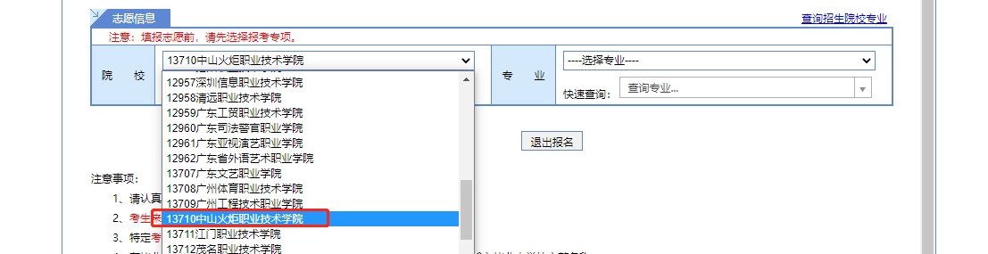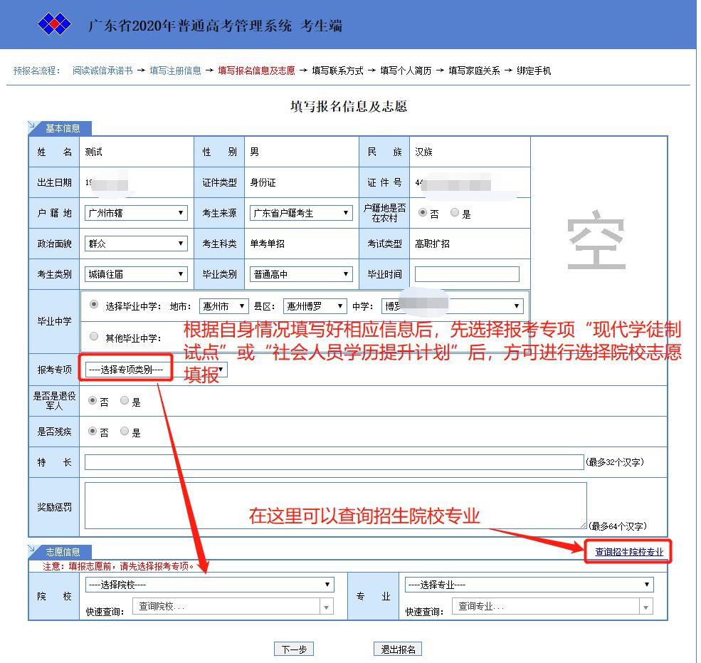 四、根据自身情况填写报名信息后,先选择报考专项,再次补齐其他未填信息,最后选择院校志愿填报。