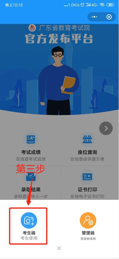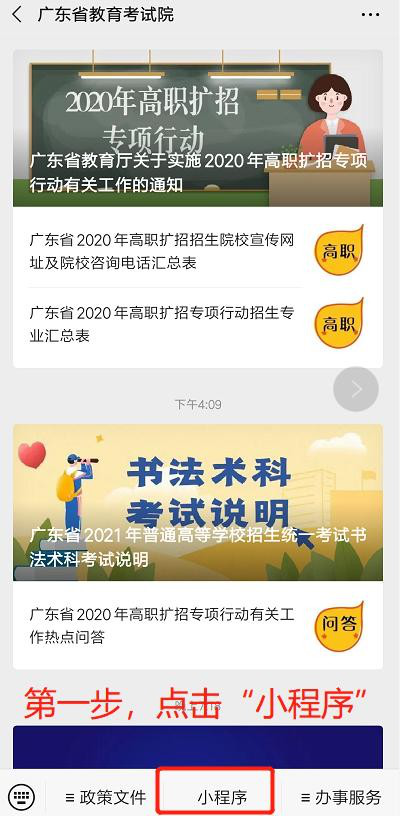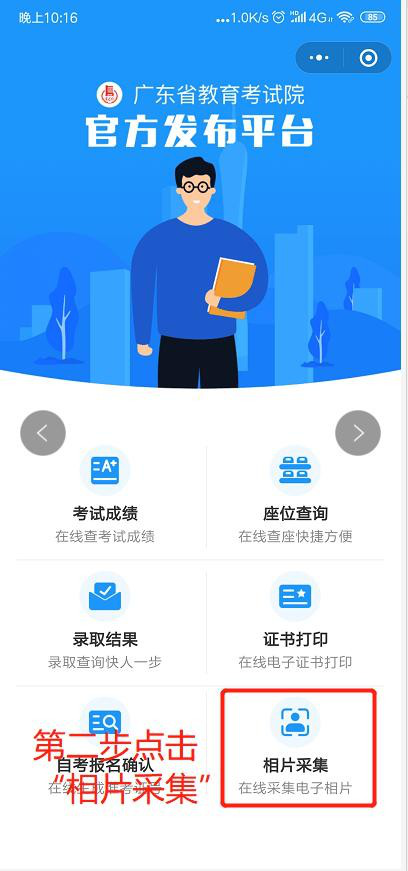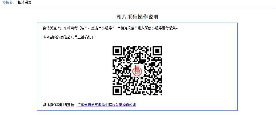 十四、打开微信,微信关注“广东教育考试院”,点击“小程序”- “ 相片采集” 进入微信小程序进行采集。 具体步骤如下: