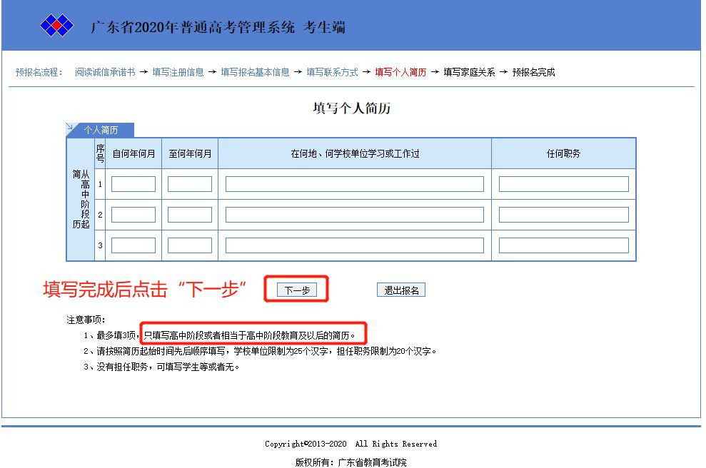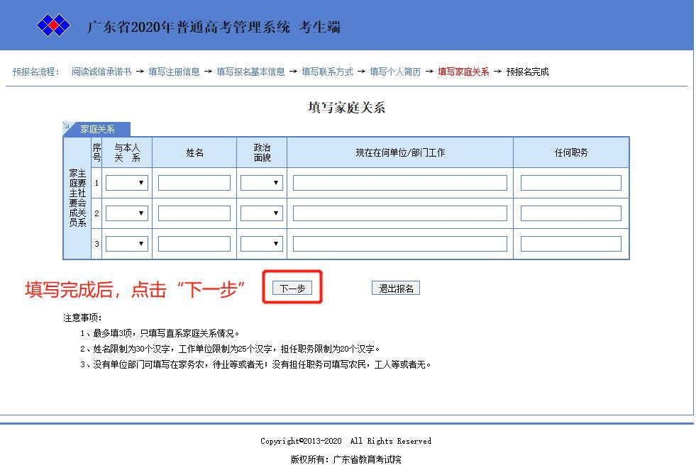 七、填写个人简历完成后,点击“下一步”按钮进入“填写家庭关系” 模块。