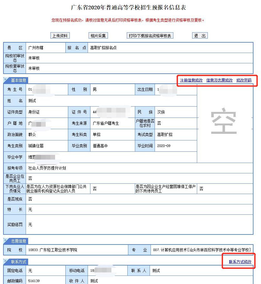 (http://www.eeagd.edu.cn/pgks),输入考生号及密码重新登录, 修改其他信息或补全信息。