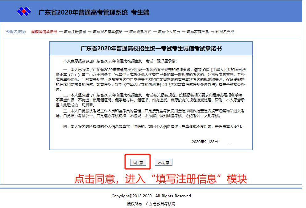 二、考生仔细阅读“广东省 2020 年普通高校招生统一考试考生诚信考试承诺书”后,点击“同意”按钮,进入“填写注册信息”模块。