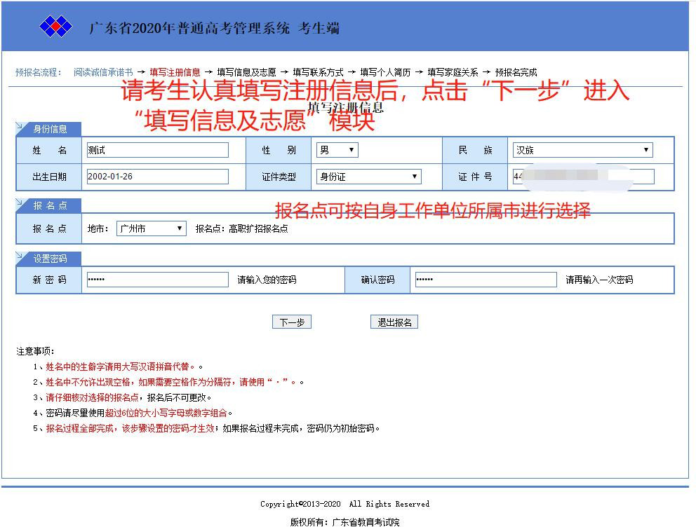三、请考生认真填写注册信息后,点击“下一步”进入“填写信息及志愿”模块。