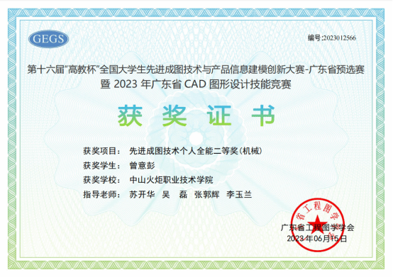 在刚刚结束的第十六届“高教杯”全国大学生先进成图技术与产品信息建模创新大赛暨 2023 年广东省 CAD 图形设计技能竞赛中,我校装备智造学院学生共获数字创新设计一等奖1项(全省第2名),先进成图技术个人全能二等奖6项、三等奖10项,轻量化设计三等奖1项,团体二等奖1项,获奖数量和获奖等级与去年相比上升了一个台阶;并有4个项目获得国赛参赛资格。